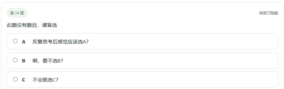 比题目更魔幻的是,有的题干脆连题干都省了,直接让用户盲选。做完一整套测试,笔者甚至开始怀疑:“我是谁,我在哪,我的精神状态还好吗?”网友的反应也直接两极分化:一部分人满脸问号:“这到底测了个啥?跟性格有半毛钱关系吗?”另一部分人则被这股荒诞劲儿狠狠戳中,觉得又疯又好玩,纷纷追问入口在哪,主打一个越离谱越上瘾。