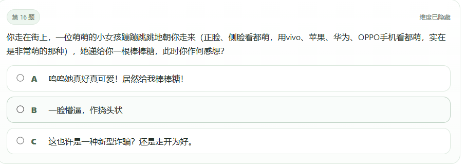 更让人哭笑不得的题目还有:“你走在街上,一位萌萌的小女孩蹦蹦跳跳地朝你走来(正脸、侧脸看都萌,用vivo、苹果、华为、OPPO手机看都萌,实在是非常萌的那种),她递给你一根棒棒糖,此时你作何感想?”