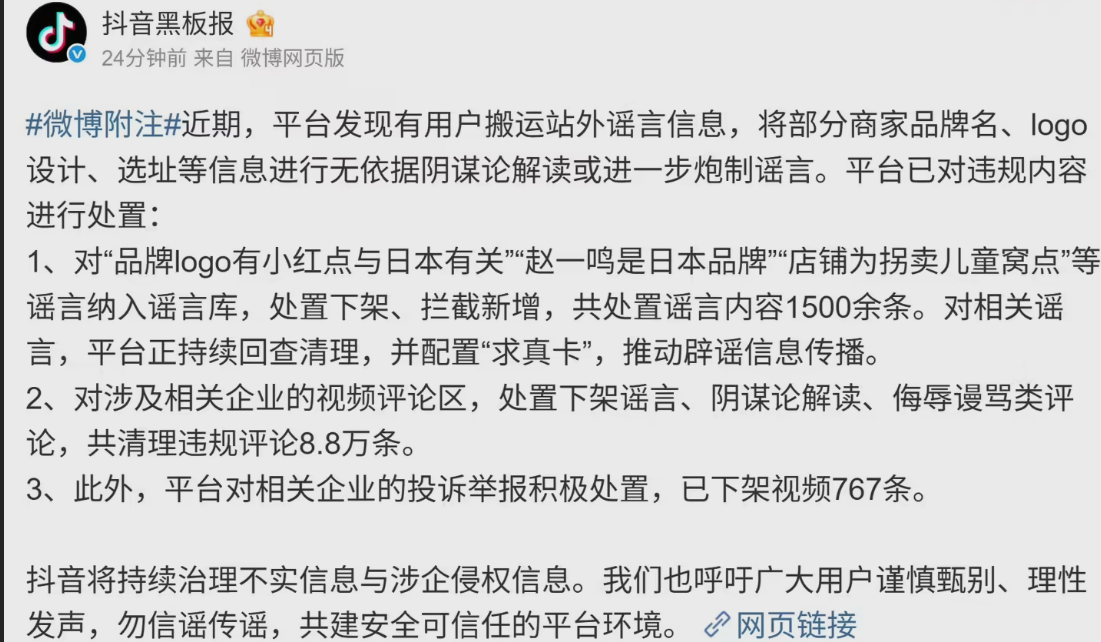 对“品牌 logo 有小红点与日本有关”“赵一鸣是日本品牌”“店铺为拐卖儿童窝点”等谣言纳入谣言库,处置下架、拦截新增,共处置谣言内容 1500 余条。对相关谣言,平台正持续回查清理,并配置“求真卡”,推动辟谣信息传播;