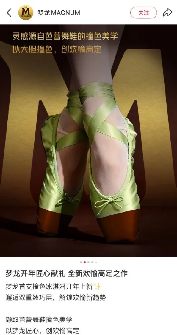 此次引发争议的广告,是梦龙为其新品“大理石纹双拼冰淇淋”打造的宣传内容。品牌试图以“芭蕾”为创意切入点,将冰淇淋与芭蕾舞鞋进行视觉关联:广告配图中,浅绿色缎面芭蕾舞鞋的造型、质感,与新品冰淇淋的浅绿色外壳高度呼应;同时搭配了多组女性特写镜头,包括女性脚部特写、女性间分享冰淇淋的亲密画面、男女喂冰淇淋的暧昧场景等。