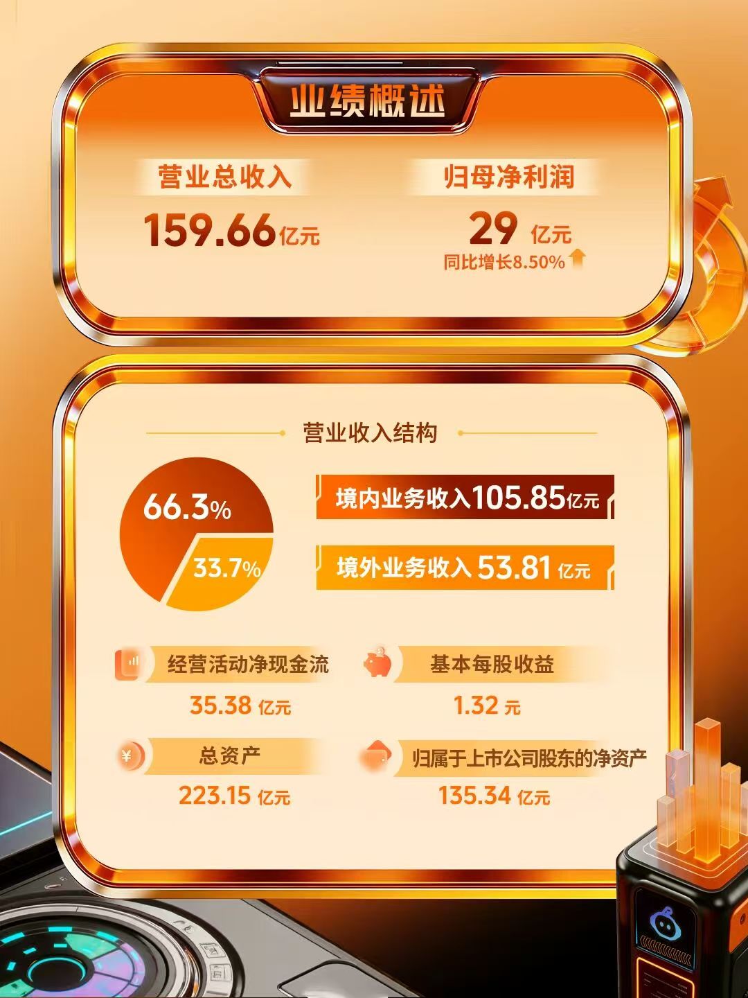 从收入结构来看,报告期内公司实现境内营业收入105.85亿元,占总营收的66.30%;境外营业收入53.81亿元,占比33.70%。