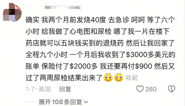 比“等不起”更现实的,是“看不起”。在国内,常规心脏检查、全套急诊(含救护车、验血、治疗)的费用分别约400元和1000元左右;而在美国,前者无保险时高达1万-2万美元(折合人民币约7-14万元),后者仅救护车费用就可能达数千美元。更有网友吐槽,在美国高烧40度,就诊耗时9小时,总费用近3000美元,即便有保险报销,个人仍需自付900多美元。