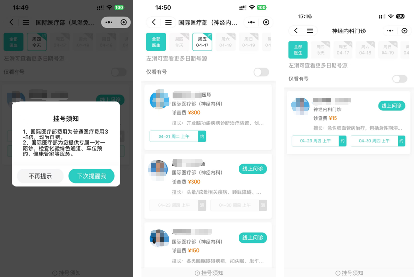 以河北医科大学第一医院为例,其国际医疗部费用约为普通门诊的3—5倍,全部自费:神经内科普通号仅15元,国际部挂号费则在150元至800元之间。高价格、独立支付、独立流程,本质都是为了避免国际患者直接进入面向大众的公益性低价体系。