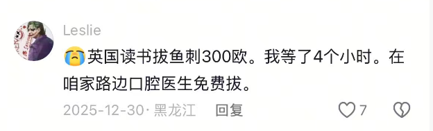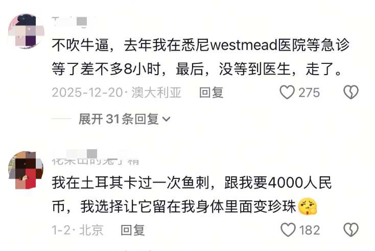 可在海外,这却成了令人煎熬的困境:有网友分享,在悉尼医院急诊等候8小时,最终没能看上医生;在土耳其,取一次鱼刺收费近4000元人民币;在英国,拔鱼刺不仅要等待4小时,还要花费300欧元。