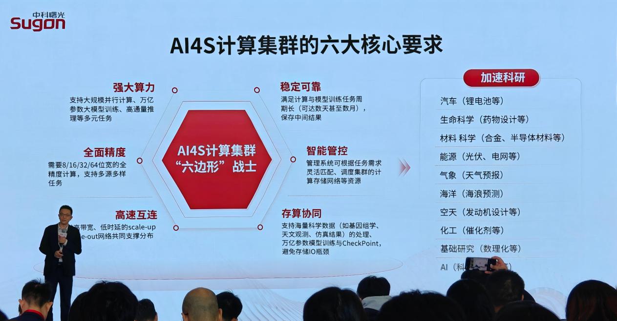 那怎么评价AI4S计算集群的能力?中科曙光给出的答案是“六大核心要求”。对应刚刚上线的6万卡科学智能计算集群系统,就是: