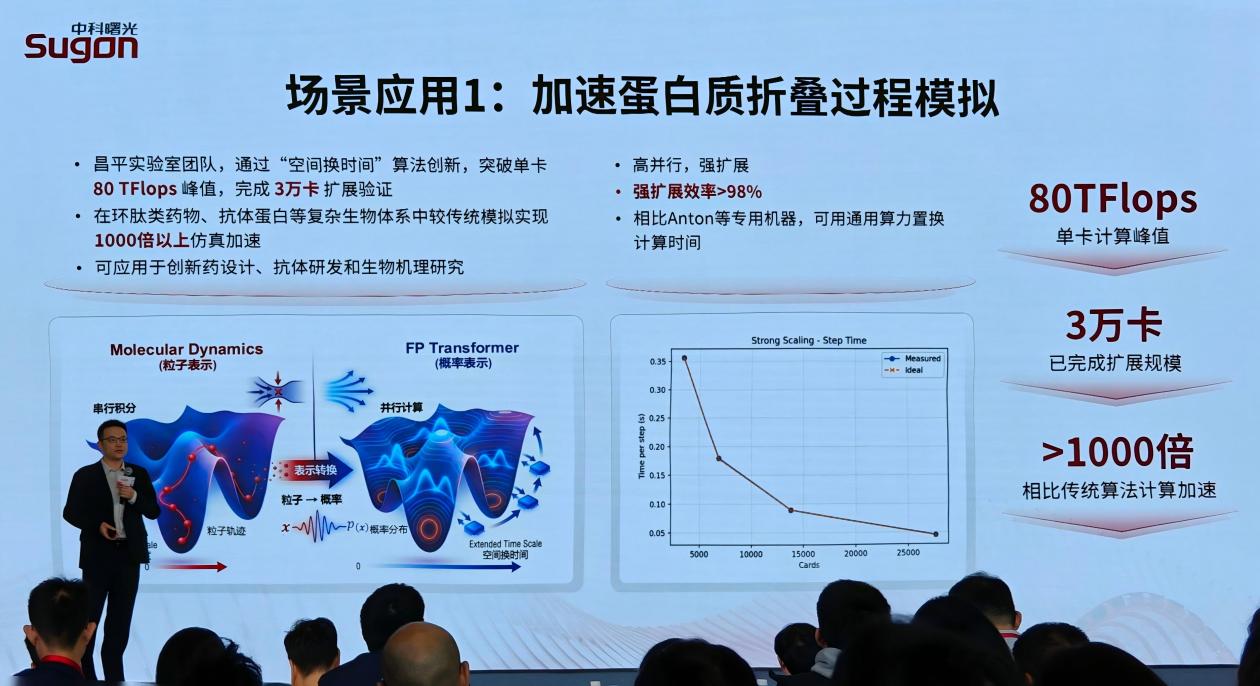 在生物、材料等多领域进行的大规模并行计算测试中,依托曙光AI4S计算集群,3万卡规模蛋白质折叠模拟较传统算法加速1000倍;4.5万卡规模实现万亿原子液态水分子动力学模拟,在打破世界模拟规模纪录的同时效率提升3个数量级以上;湍流直接模拟规模扩展至百万亿网格,大幅提升了科研效率。