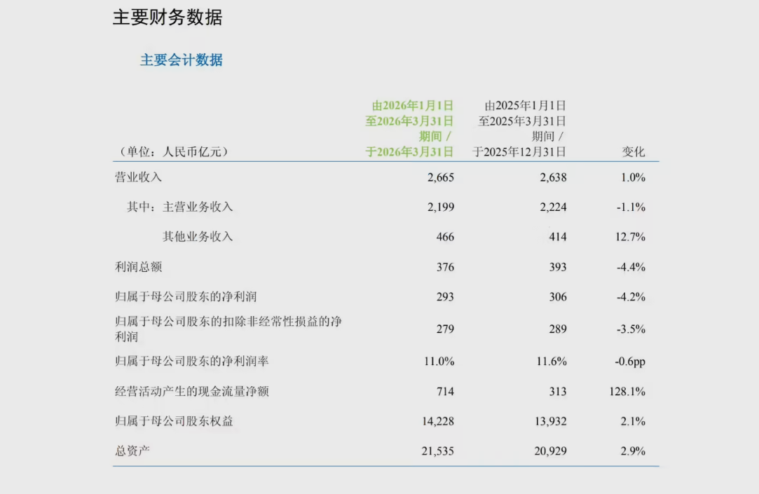 归属于母公司股东的净利润:293 亿元,同比下降 4.2%