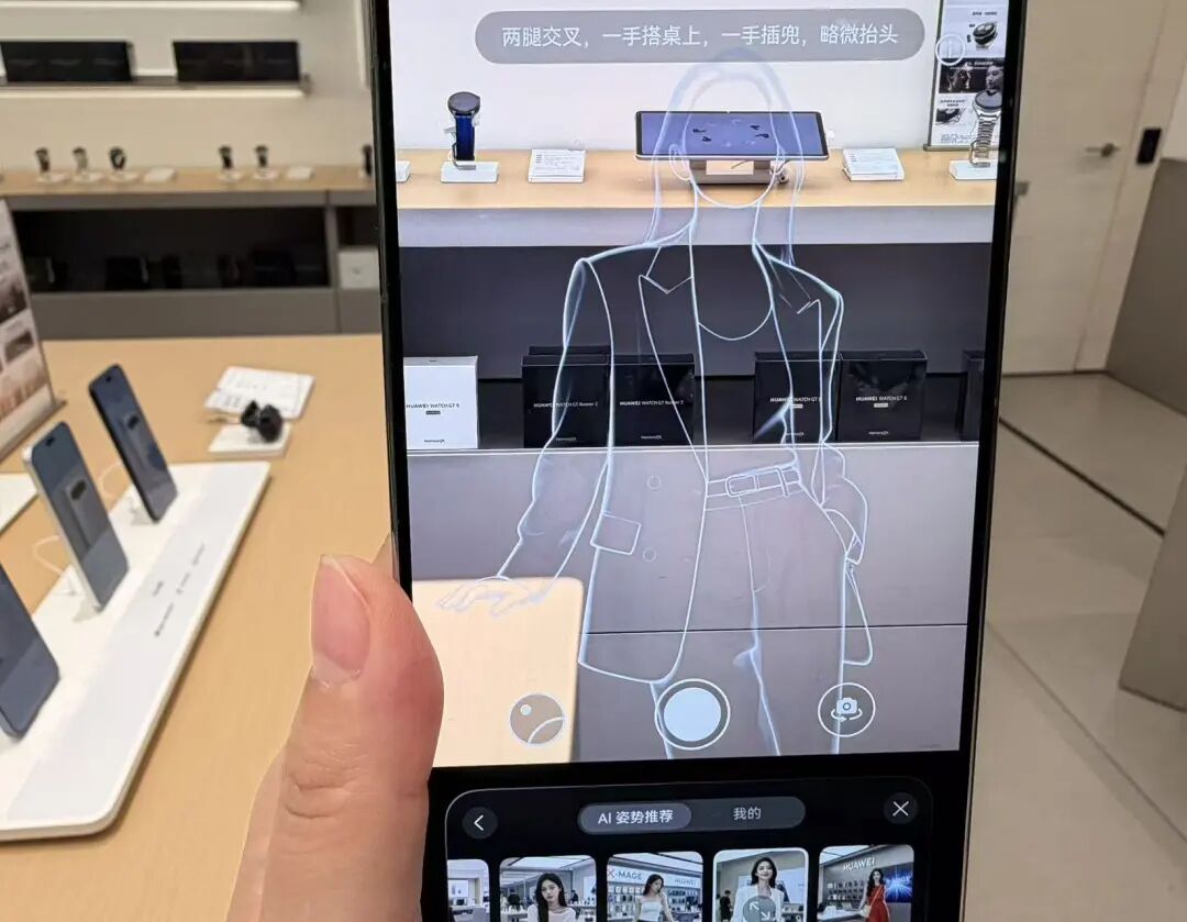 简单说,以前拍人像,几乎都要靠摄影师喊“腿往前伸”“脸侧一点”“下巴往里收”!但是现在,当你拿起Pura 90 Pro手机拍照的时候,取景框里会出现一个半透明的骨架轮廓,你只需要引导模特把身体往那个轮廓里“套”。方便的是,它可以把小红书、Instagram上的热门打卡姿势直接导入本地作为模板。