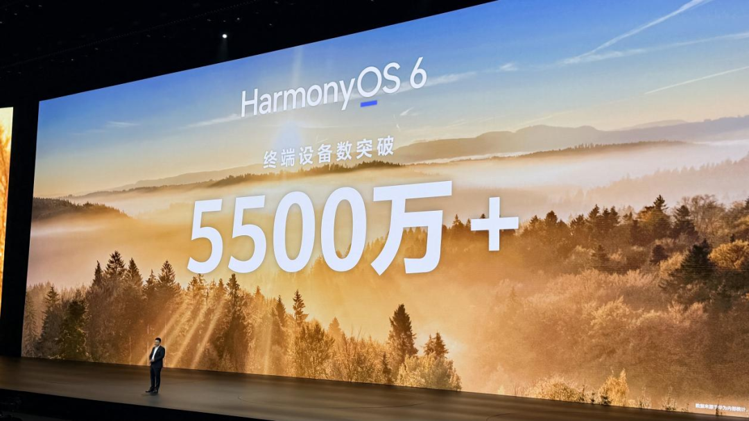 余承东现场披露,过去不到半年时间里,搭载鸿蒙HarmonyOS 6的终端设备新增2300万台,目前总量已正式突破5500万台,鸿蒙正从“可用”加速迈向“好用”。