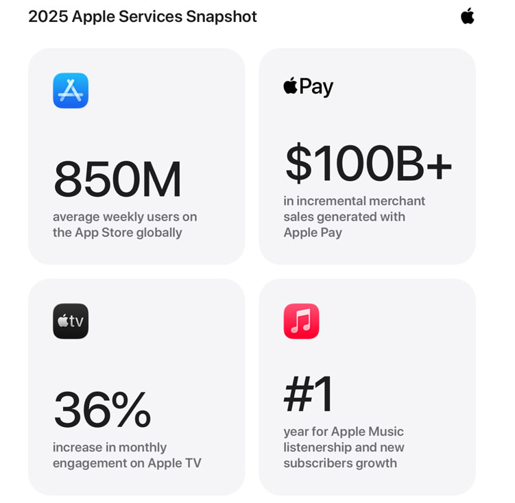 三是库克始终将服务业务作为战略重点,从iCloud、Apple Pay到Apple TV、Apple Music,逐步构建起多元化的服务体系。苹果称,“服务规模已超过1000亿美元,相当于财富40强企业的水平。”