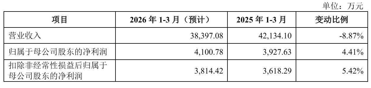 福恩股份预计2026年第一季度营收为3.84亿,较上年同期的4.2亿元下降8.87%;预计净利为4100万元,较上年同期的3928万元增长4.4%;预计扣非后净利为3814万元,较上年同期的3618万元增长5.4%。