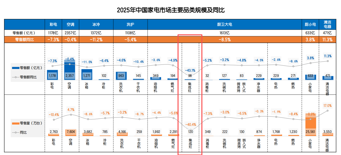 地产周期波动引发的市场需求持续萎缩、人力与渠道成本高企、产品同质化加剧价格战内卷。多重压力交织下,“亏损”成为2025年集成灶行业的核心注脚。
