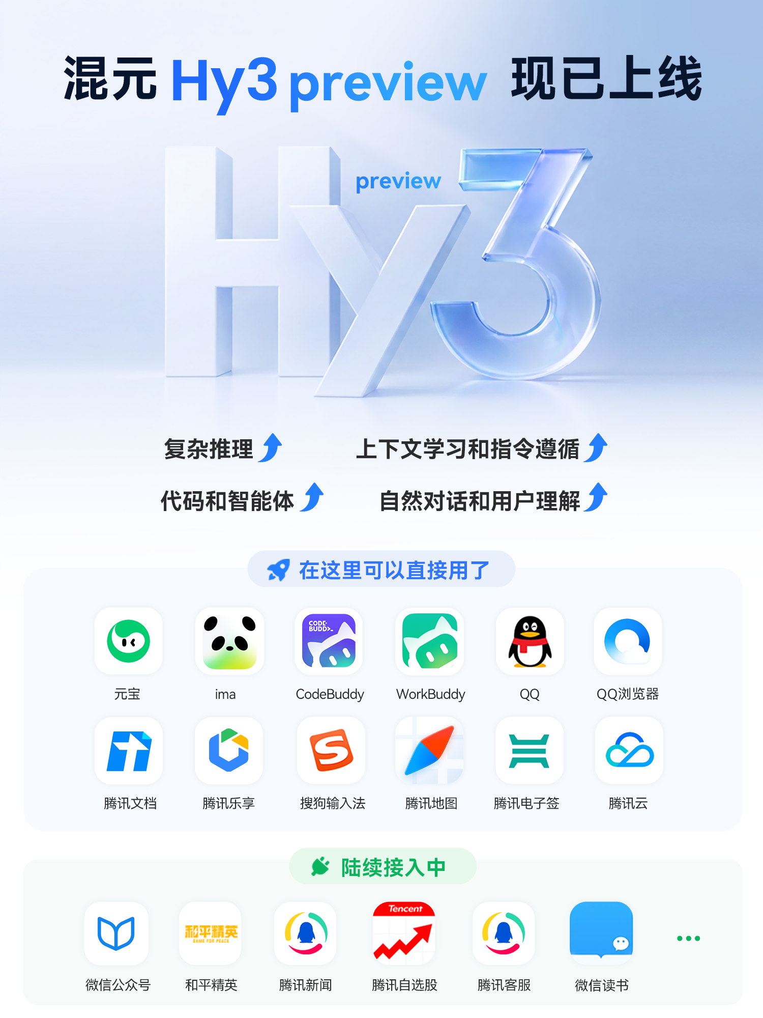 Hy3 preview 已在元宝、CodeBuddy、WorkBuddy 、QQ、ima、QQ 浏览器、腾讯文档、腾讯乐享上线,并在微信公众号、腾讯新闻、腾讯自选股、和平精英、腾讯客服等多个产品陆续上线中。