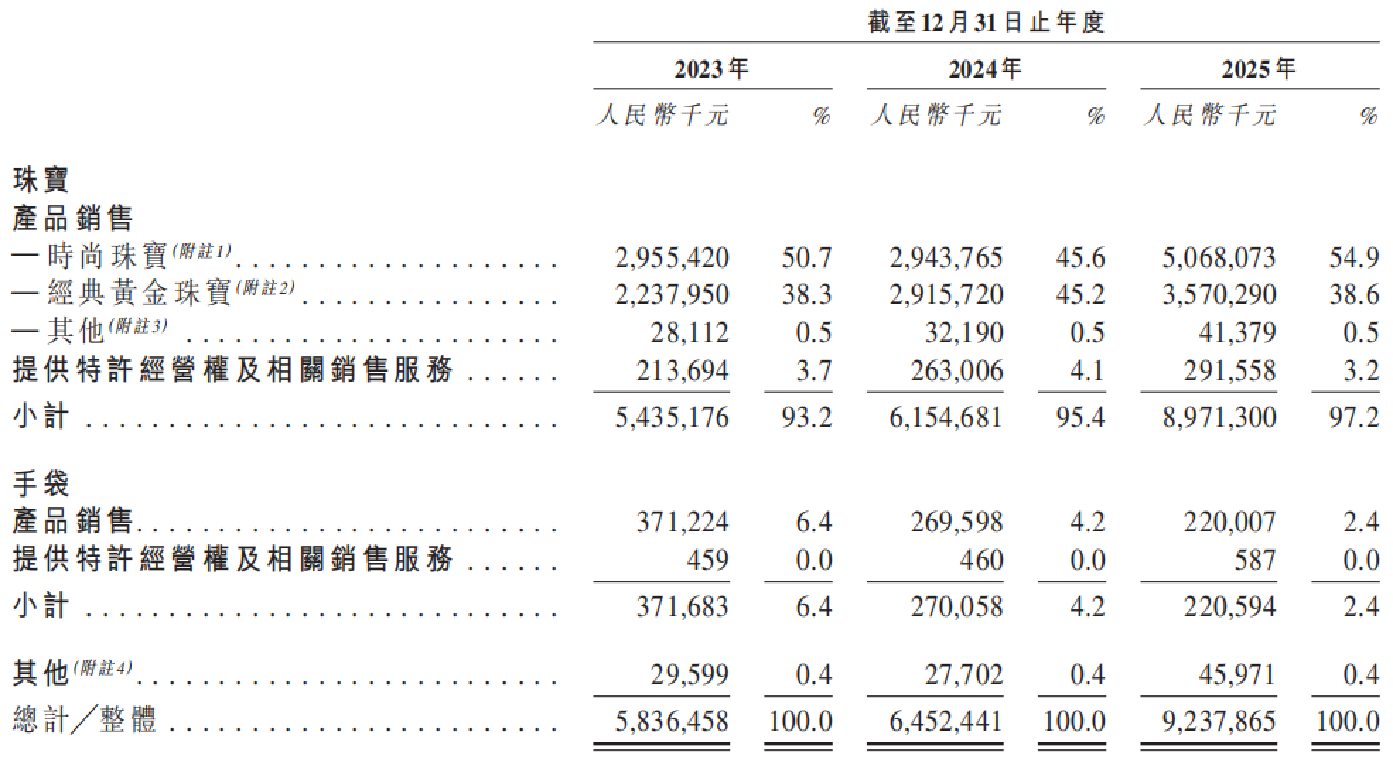 按照业务构成,珠宝业务可以进一步拆分为时尚珠宝、经典黄金珠宝两个细分业务。其中,时尚珠宝业务的爆发是潮宏基业绩超预期的主要驱动力。2025年,时尚珠宝业务收入达到50.68亿元,同比大增72.1%,而传统黄金业务亦保持稳健增长,实现收入35.70亿元,同比增长22.4%。两大细分业务均实现增长,从而带动珠宝业务同比增长45.8%至89.71亿元,占营收的比例由2023年的93.2%进一步增长至97.2%,成为潮宏基绝对的营收支柱。
