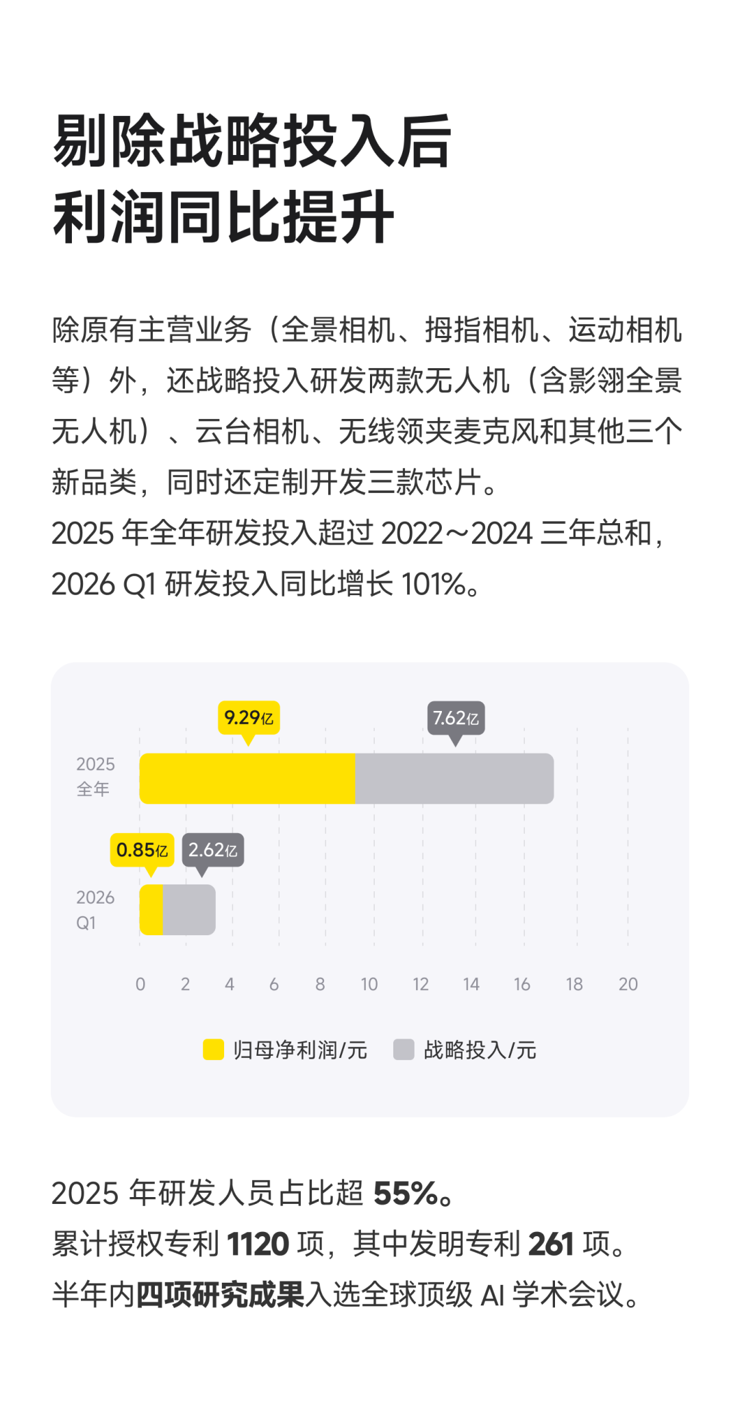 影石创始人刘靖康在同期发布的股东信中表示,受战略投入加大、市场竞争及存储元器件涨价影响,公司相关利润指标下滑,这旨在换取长期业绩和健康发展。