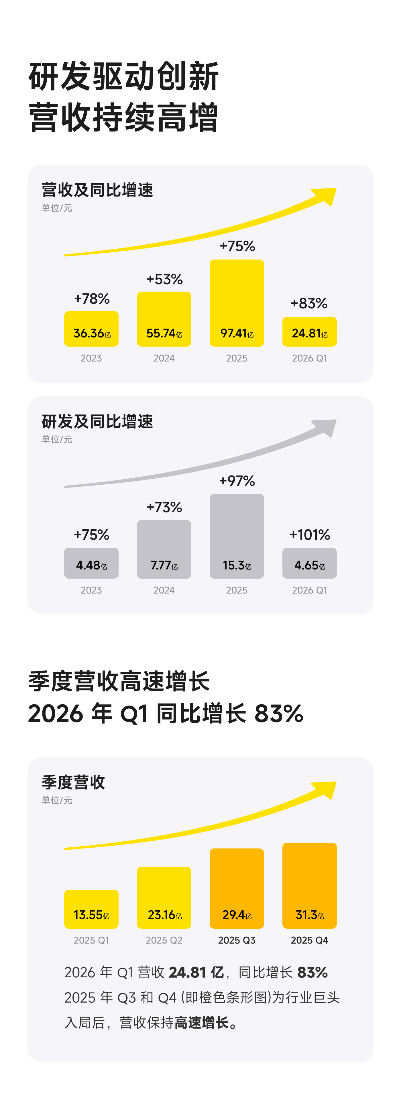 DoNews4月28日消息,影石创新今天发布 2025 全年及 2026 年一季度业绩,多项核心指标达历史新高。2025 年营收 97.41 亿元,同比增长 74.76%;2026 年一季度营收 24.81 亿元,同比增长 83.11%。三年营收规模扩张近 3 倍,复合增长率超 63%。