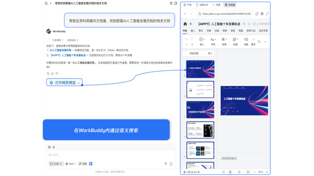 没关系,他直接在WorkBuddy搜索框里大白话输入:「找到那份AI发展历程报告」。依托强大的自然语言语义搜索,腾讯文档云端报告立刻被精准定位弹出。点击「添加至任务」,AI 立马开工,快速提炼出核心摘要。