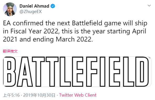 近日EA宣布《战地》系列游戏作品新作将会在2022财年(EA公司2022财年是从2021年4月1日至2022年3月31日之间)内发售,这意味着DICE开发的《战地》新作至少要到明年(2021年)4月才会发售。