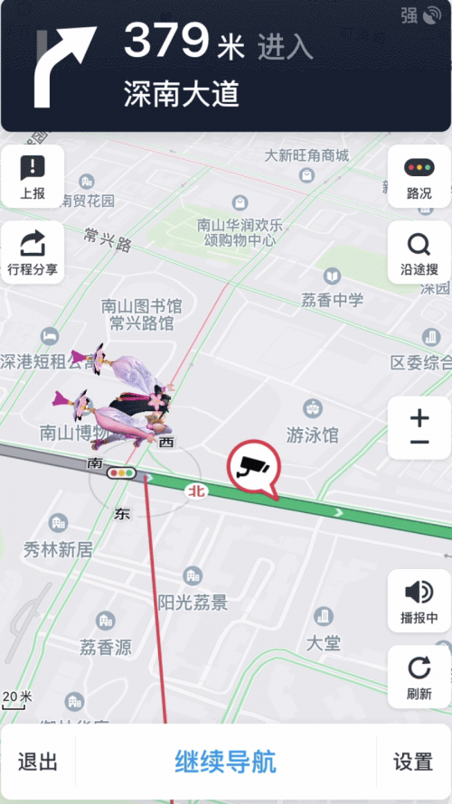 在导航模式下,用户可以看到以往的2D车标变成了三位英雄的3D形象:王昭君手握权杖全力推塔,安琪拉手捧魔法书快乐飞驰,貂蝉一路闪现直达终点,让用户在出行途中也犹如身临王者峡谷。