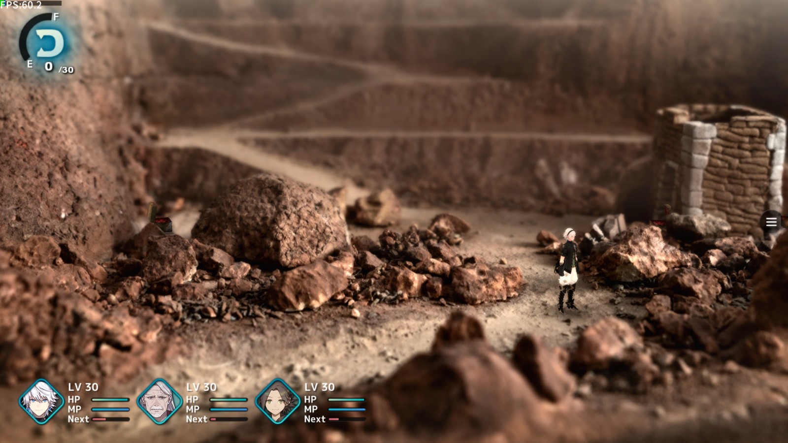 从画面中可以看到,左下角显示了角色头像,根据常理推断,白发男子应该就是主角,尽管队伍中有3人,但在游戏地图中只显示1人。除了角色等级之外,HP、MP以及经验条都显示在了左下方,而左上方显示了游戏帧率为60.2FPS。