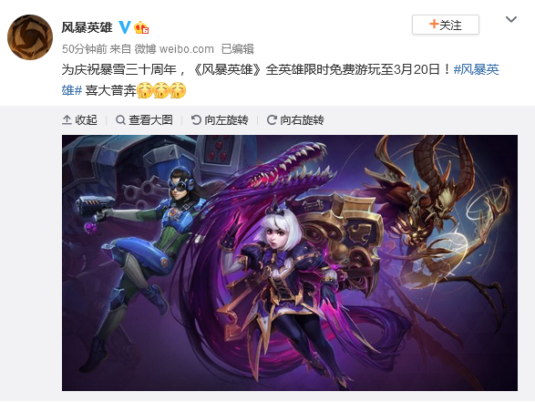 《风暴英雄》官方今日(2月24日)宣布:为庆祝暴雪三十周年,《风暴英雄》全英雄限时免费游玩至3月20日。感兴趣的玩家可以对这款游戏进行关注。