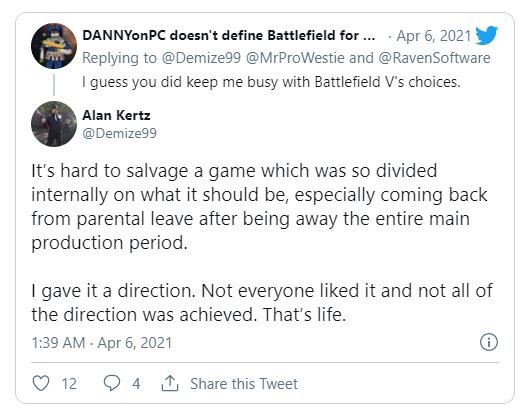 近日,在国外社交媒体上,前DICE员工兼《战地5》的设计总监Alan Kertz发表了一些自己在《战地5》的开发中发生的一些事情。在其中一条推文中,Kertz提到游戏很难“补救”,因为在公司及游戏“内部存在着分歧”。