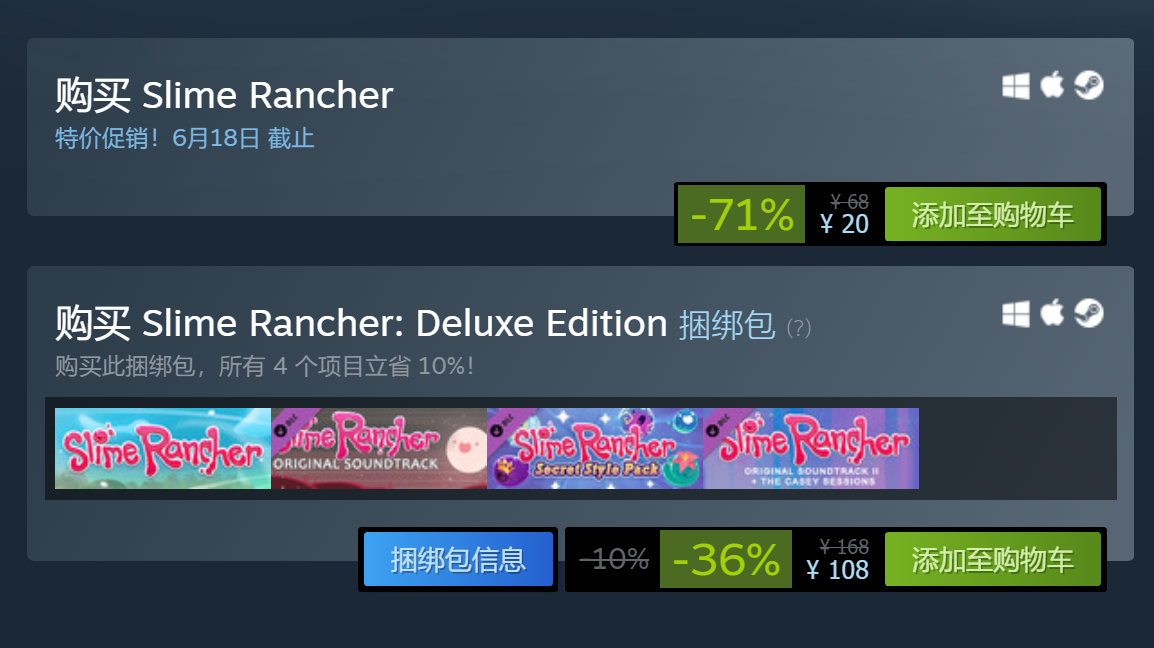 目前,独立冒险游戏《Slime Rancher》已经在Steam商城开启了特惠活动。该游戏原价68元,29%的折扣,现价20元,活动截止至6月18日。另外,该游戏的捆绑包《Slime Rancher: Deluxe Edition》也参与了打折活动,原价168元,现价108元。