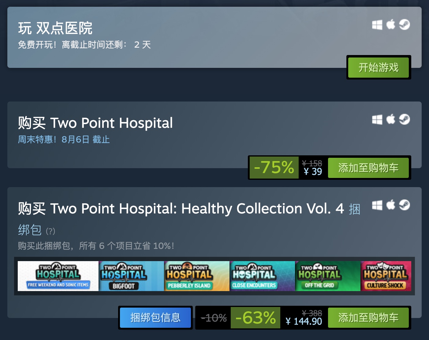 另外,《双点医院》还在Steam商城开启了周末两天的免费试玩活动,同时本作还开启了限时优惠活动,游戏售价39元(原价158元),优惠截止时间为8月6日。