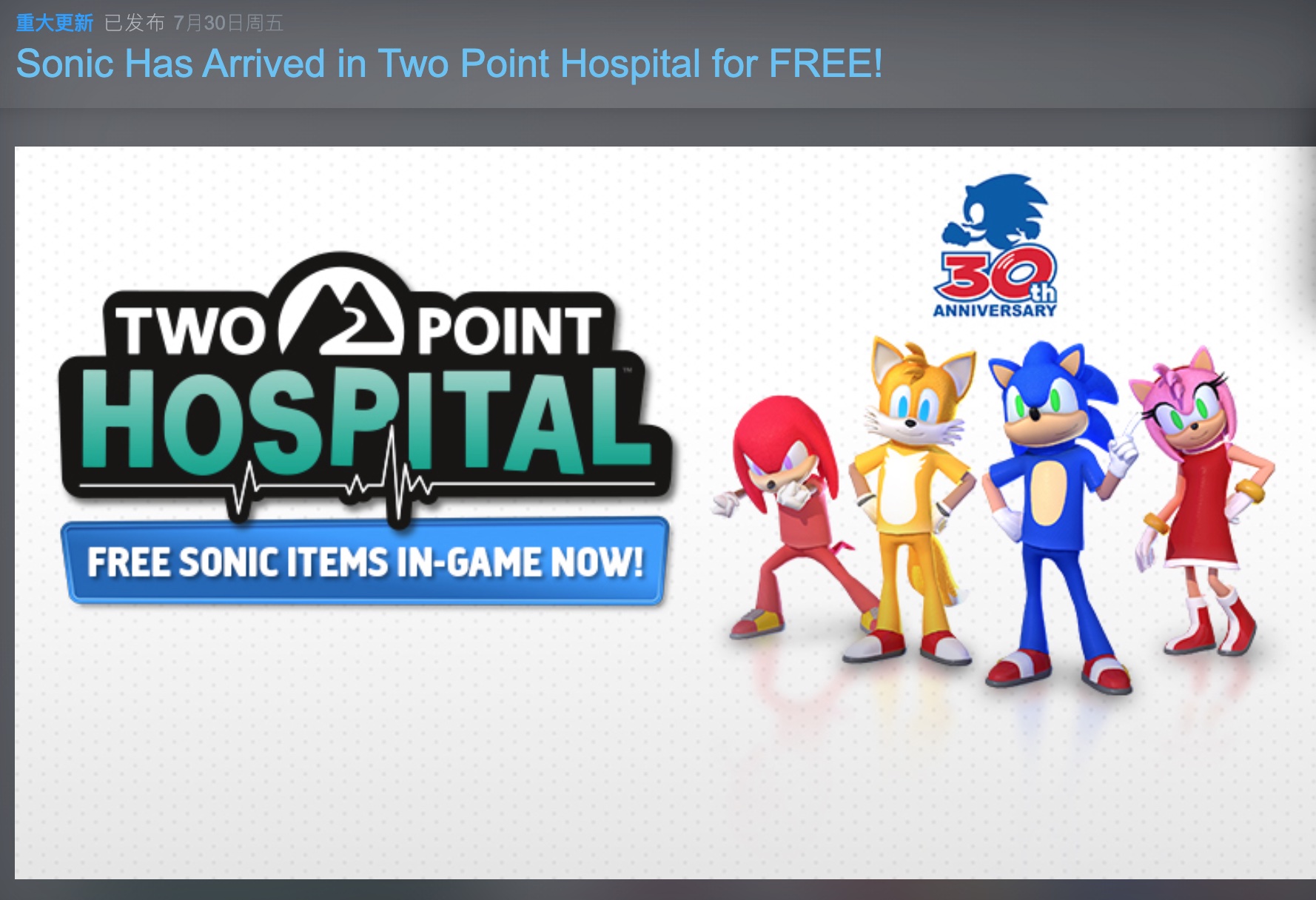 《双点医院》于昨日(7月30日)晚间在Steam商城发布公告,宣布本作将加入免费的《索尼克》联动内容。