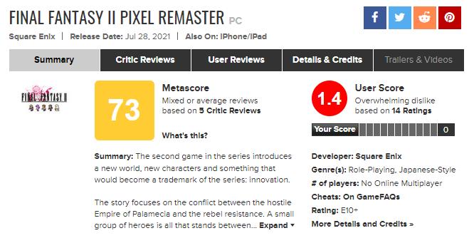《最终幻想1》像素复刻版现用户评分2.9,而在这之前,它的用户评分是0.7,《最终幻想2》像素复刻版为1.4分,《最终幻想3》像素复刻版为2.3分。目前官方还尚未做出回复。