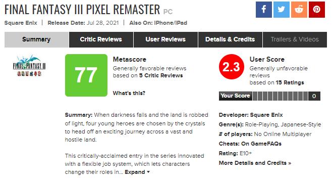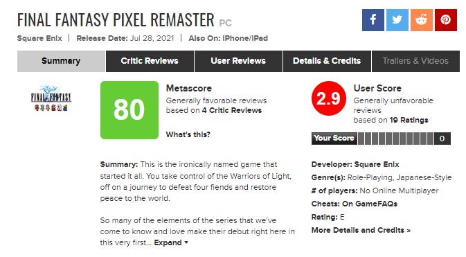 Steam平台发售了《最终幻想1-3》像素复刻版,《最终幻想4-6》像素复刻版将在晚些时候发售。但近日,这三款游戏在Metacritic站上都遭遇用户低分,原因是因为游戏没有主机版。