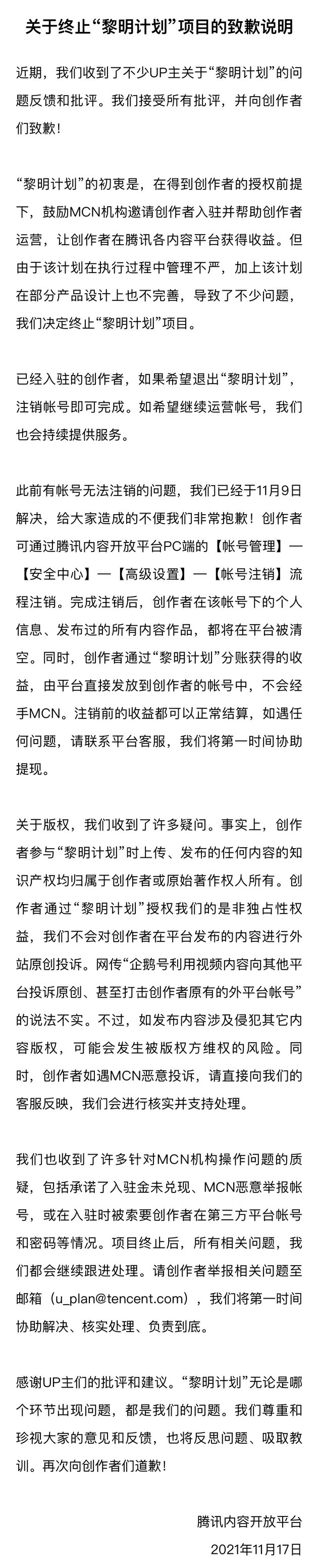 通告称,“黎明计划”的初衷是让创作者获益,但由于腾讯管理不严,加上产品设计不完善,导致了不少问题,因此公司决定终止该项目。已经入驻的创作者,如果希望退出,注销帐号即可。如希望继续运营,腾讯也会持续提供服务。