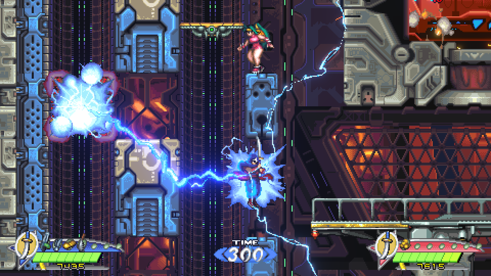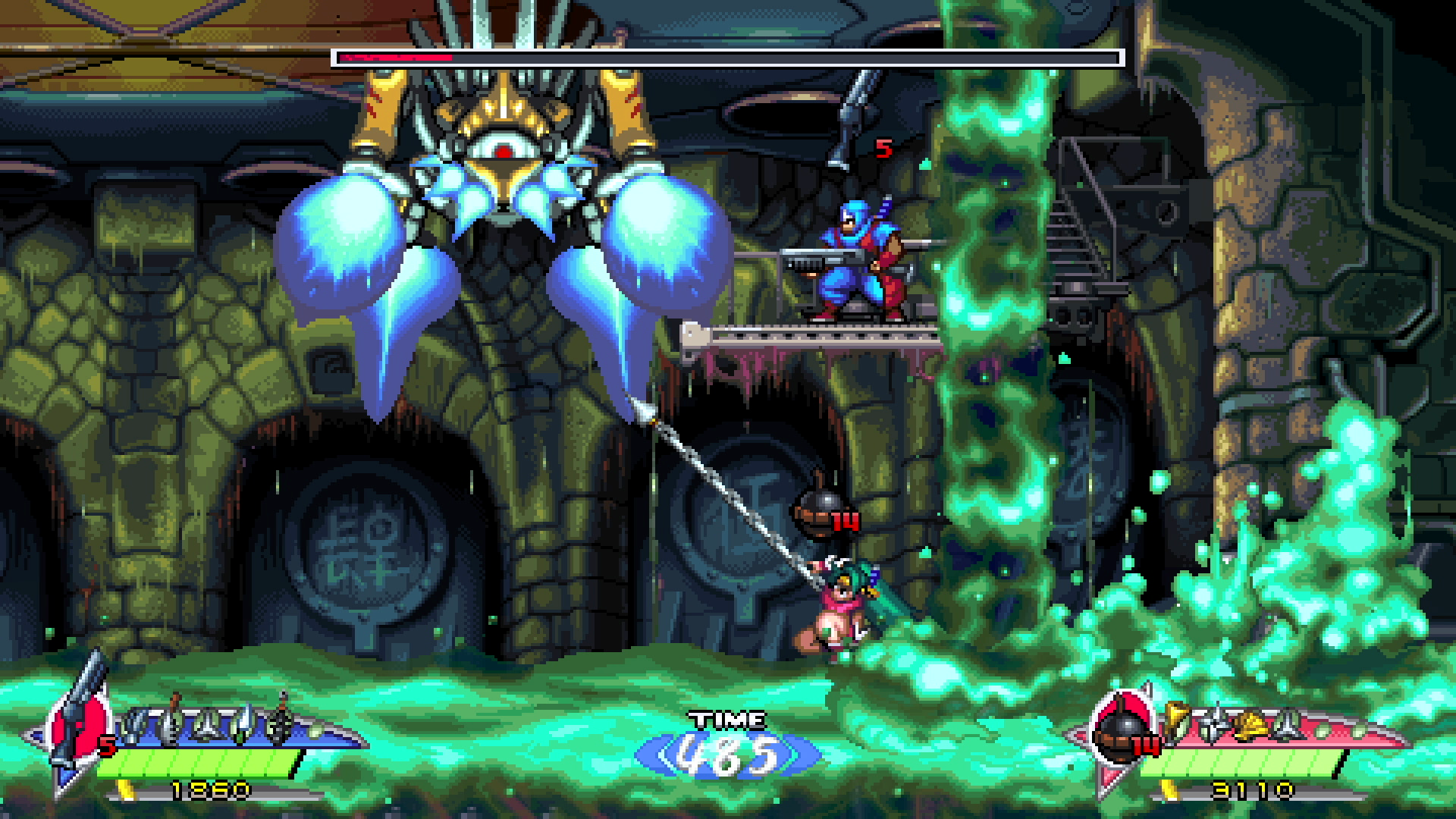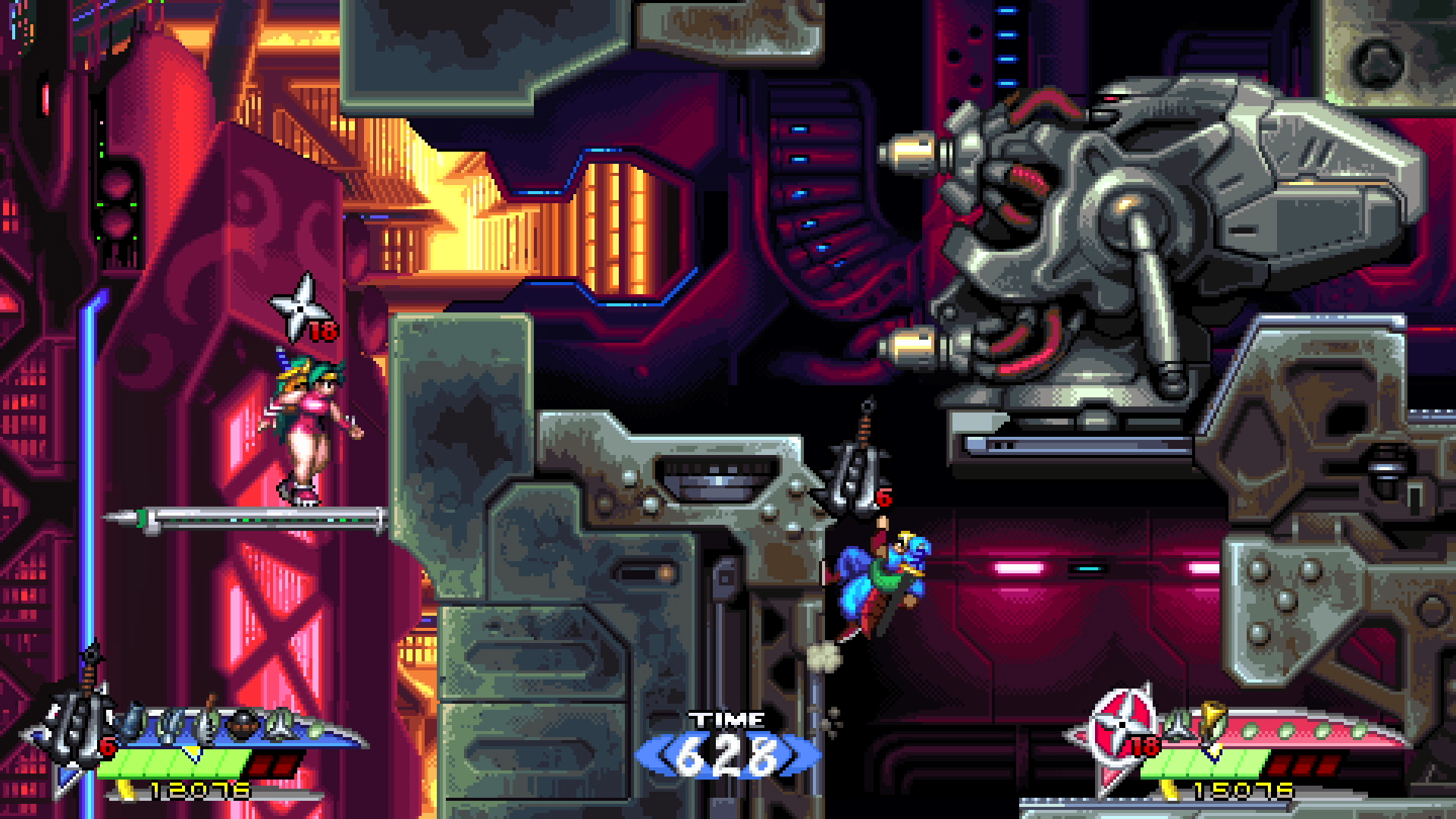 游戏共有街机和竞速两种模式可供玩家选择。在街机模式中,有普通和困难两个可选难度,你既可以从飒(Hayate)与枫(Kaede)两个角色中任选其一进行单人游玩,也能与好友一起合力闯关,从头到尾完整地体验多个被完全重新设计的关卡内容。