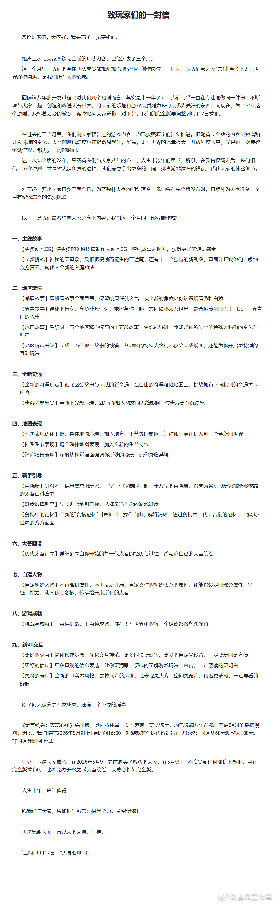 DoNews3月12日消息,螺舟工作室 11 日发布了《致玩家们的一封信》,宣布《太吾绘卷:天幕心帷》完全版定档 2026 年 6 月 17 日上线。