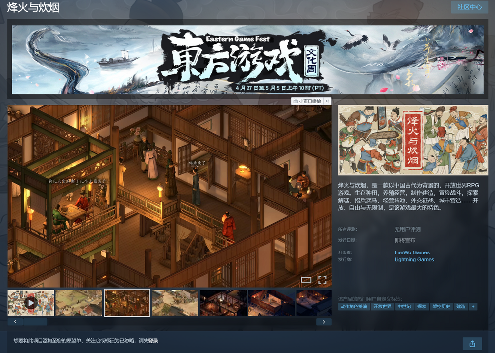 《烽火与炊烟》是一款以中国古代历史为背景的开放世界RPG游戏,融合了生存种田、经营建造、冒险战斗、国家治理等丰富玩法。