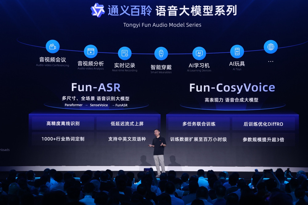 2025杭州云栖大会上,通义大模型家族还迎来了全新的成员——语音大模型通义百聆,包括语音识别大模型Fun-ASR、语音合成大模型Fun-CosyVoice。Fun-ASR基于数千万小时真实语音数据训练而成,具备强大的上下文理解能力与行业适应性;Fun-CosyVoice可提供上百种预制音色,可以用于客服、销售、直播电商、消费电子、有声书、儿童娱乐等场景。