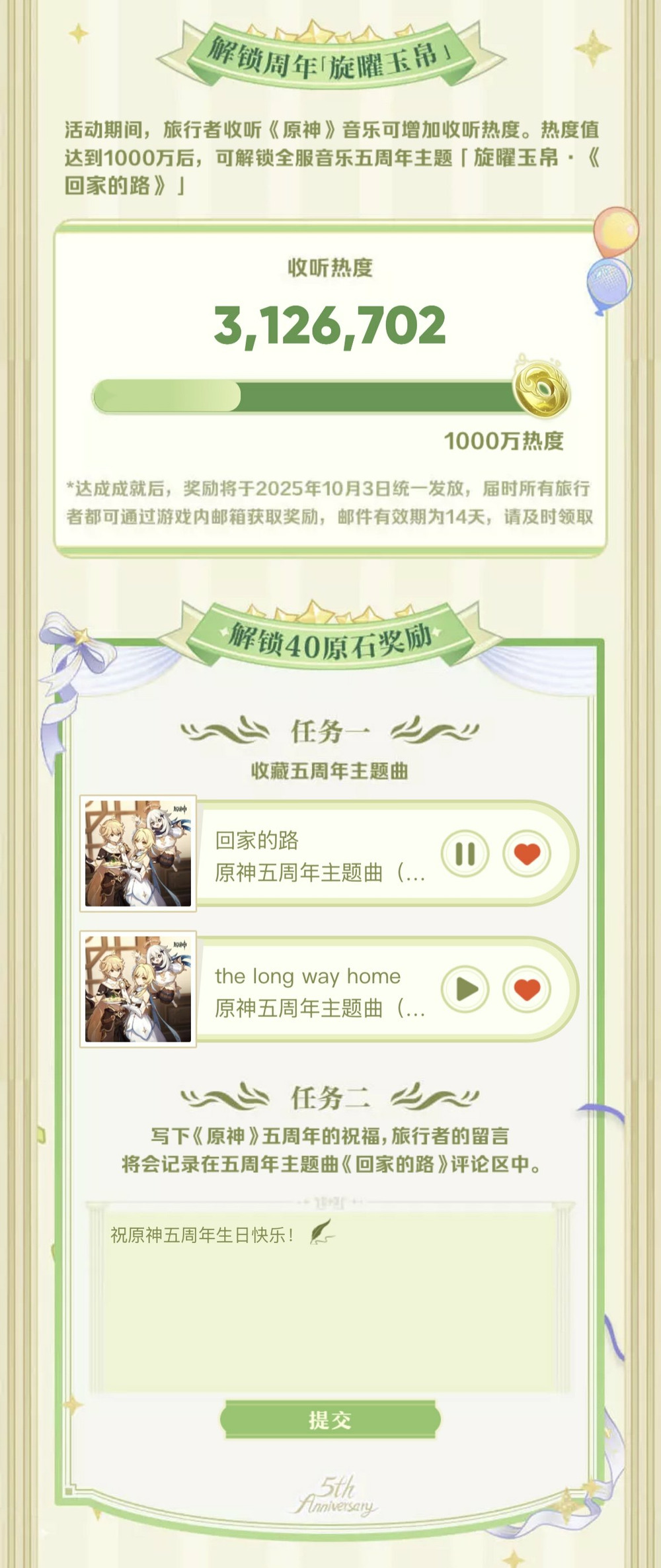 本次活动将于9月28日正式开启,用户进入QQ音乐专属活动页面即可开启“音乐巡礼。完成音乐任务后,玩家可直接领取包含40原石的游戏内礼包。通过收听《原神》游戏内的相关歌曲积累收听热度,还可解锁游戏内限定道具ꮑꮑ「旋曜玉帛·《回家的路》」。