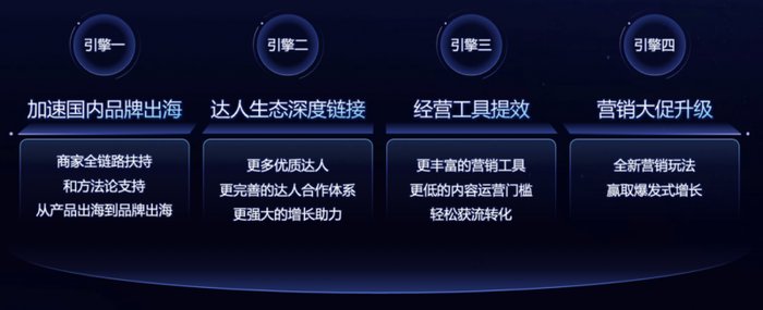 根据「庄帅零售电商频道」了解,今年2025 TikTok Shop东南亚跨境电商年度峰会上,提出的“加速国内品牌出海、达人生态深度链接、经营工具提效、营销大促升级”的四大引擎,目的就是帮助中国商家从产业升级、生态协同、商家运营、营销创新维度,构建一套跨境电商的系统化增长体系,从而降低投入成本,实现“投入即见效”的精准增长。