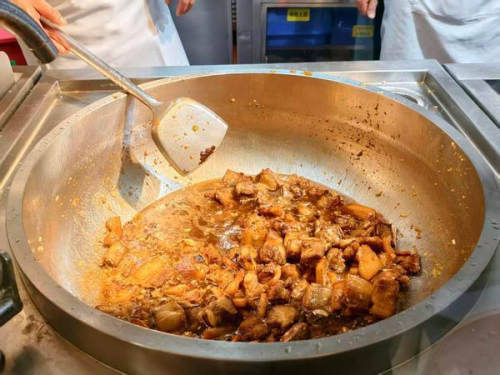 以一道猪排烩酸菜为例,原本,这道菜中的猪排是中央厨房熟制后配送到门店,根据点单情况再加入酸菜炒制出餐,现在则完全是后厨现切现做。“炒猪排需要准备猪五花、猪前肩肉、猪排三种肉,根据油脂比例先后下锅,炒熟一锅猪排需要40分钟。”厨师长表示,猪排备好后,还需加入酸菜、土豆等配菜按份炒制出餐,而一锅猪排能制作19份猪排烩酸菜。“如果打烊有剩余,也只会报损处理,绝不隔夜。”