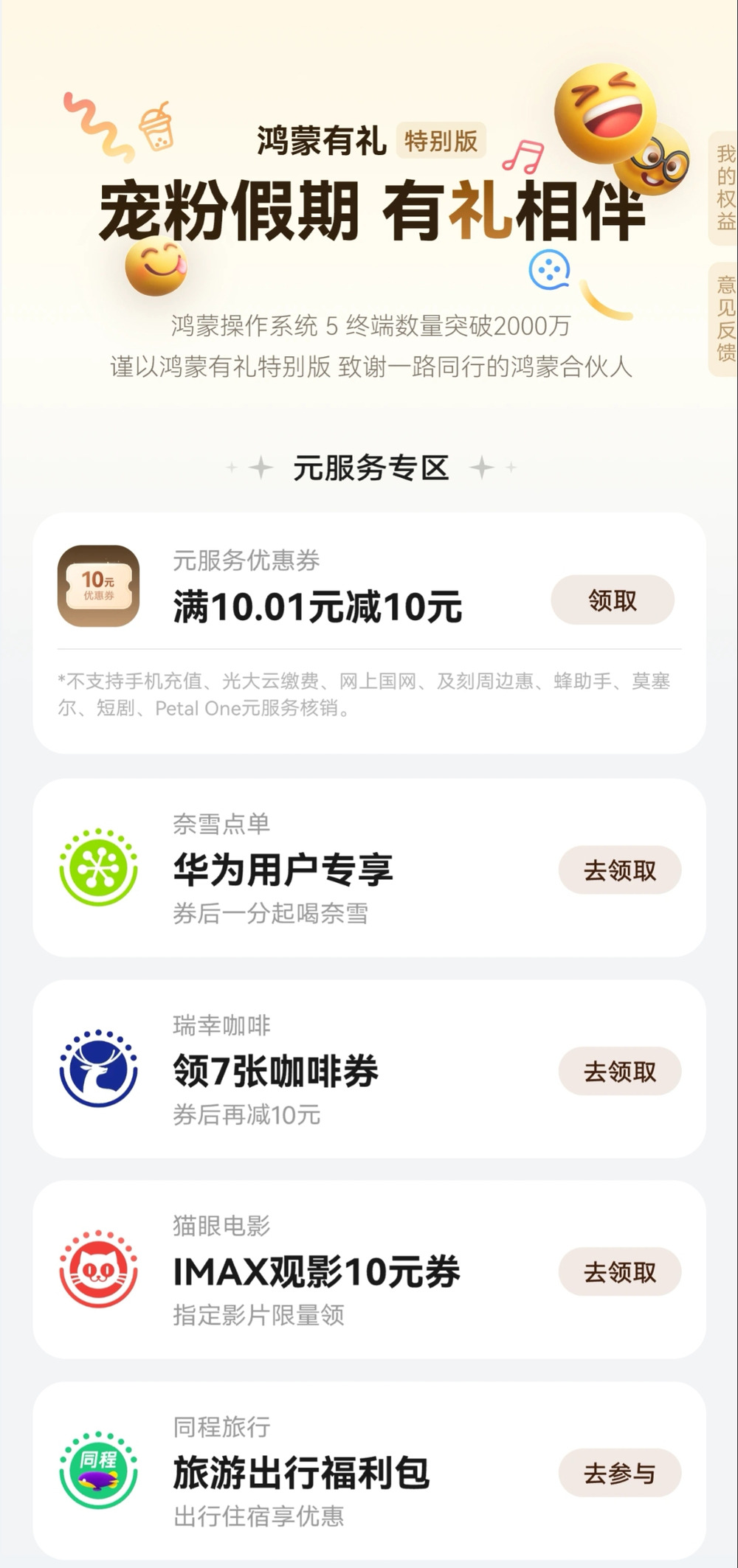 除此之外,也有近20家伙伴积极参与到了华为推出的“鸿蒙有礼特别版”活动中,让用户在假期数字生活中感受到更多便捷与乐趣。鸿蒙5及以上手机用户右滑进入负一屏,即可看到“鸿蒙有礼特别版”专属入口,领取来自奈雪的茶、瑞幸咖啡、猫眼电影、同程旅行、哈啰租车、莫塞尔、万达电影、支付宝、美团、云闪付、滴滴出行、华住会、飞猪、百度、三联中读、京东快递、半月谈等伙伴提供的丰富福利,包括各类元服务优惠券、现金红包、礼包等等。