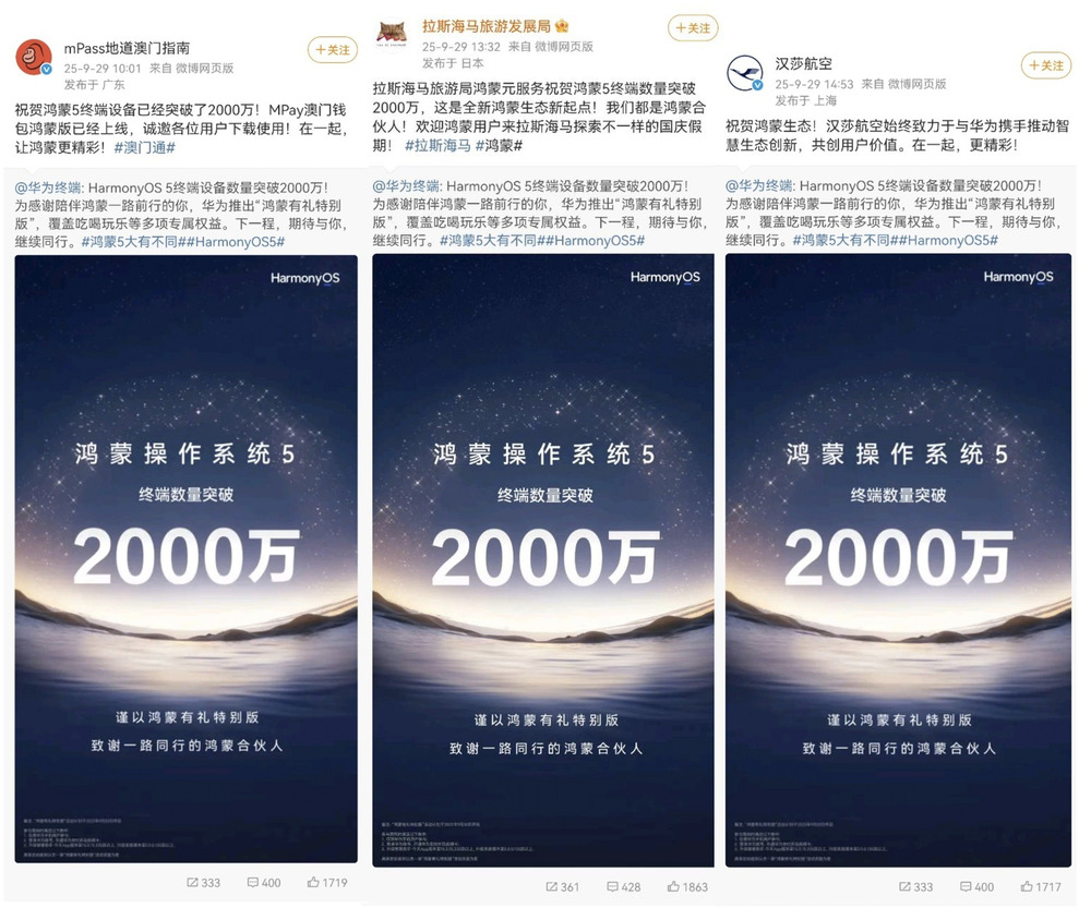 鸿蒙生态的最新进展,迅速引发了伙伴侧的热烈响应。尤其在双节出行高峰即将到来之际,德国汉莎航空、拉斯海马旅游局等海外出行文旅类核心伙伴,以及澳门本地生活服务代表“mPass地道澳门指南”,集体送上祝贺,以实际行动表达对鸿蒙生态的祝贺和期许。