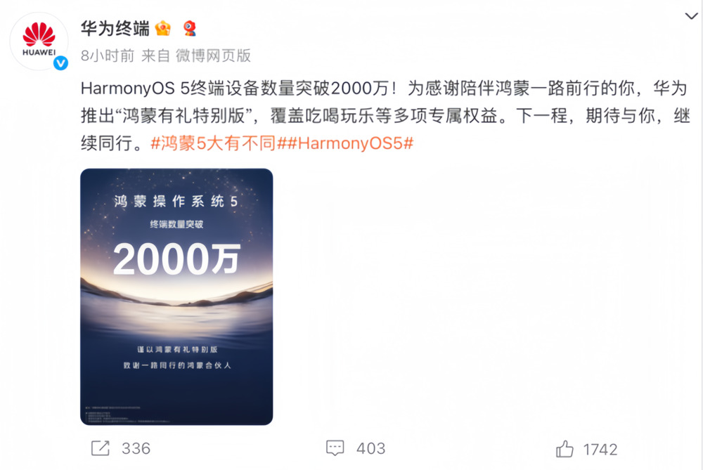 9月29日,华为终端官方微博对外公布,HarmonyOS 5终端数量历经两年发展已突破2000万,从0到1000万,鸿蒙5走了近10个月;而从1000万到2000万,仅用了2个月。这一数据不仅标志着鸿蒙生态迈入爆发式增长的新阶段,还将进一步强化伙伴信心,成为海内外应用厂商加速共创、促进鸿蒙生态持续繁荣的重要推动力。