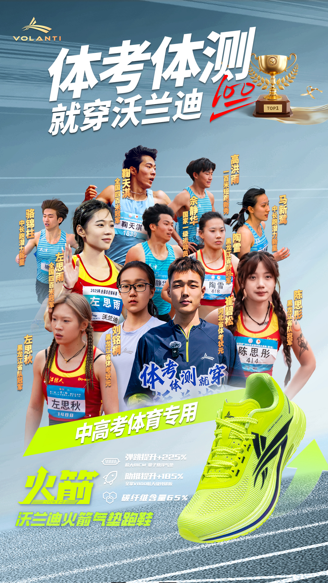 而沃兰迪的根基是“十年专注田径”:自创立起便扎根田径领域,构建“研发-生产-销售”全链条体系,4大生产基地、50余条产线仅服务田径装备,从专业运动员的赛场需求出发,用国际训练基地实测数据反哺产品研发,再进行技术下放,精准落地到体考体测场景——比如针对体考百米、跳远等场地竞技项目,研发超导纯碳速度板提升推进力,用仿生鞋楦解决场地长时间运动磨脚问题。这种“从专业赛场到体考体测”的切入路径,是泛大众运动领域品牌无法复制的。