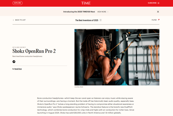近日,《TIME》(时代周刊)公布2025年度最佳发明榜单,韶音OpenRun Pro 2凭借突破性开放式声学技术、卓越的音质表现,及舒适佩戴体验荣登榜单,成为本年度音频领域备受瞩目的创新产品之一。
