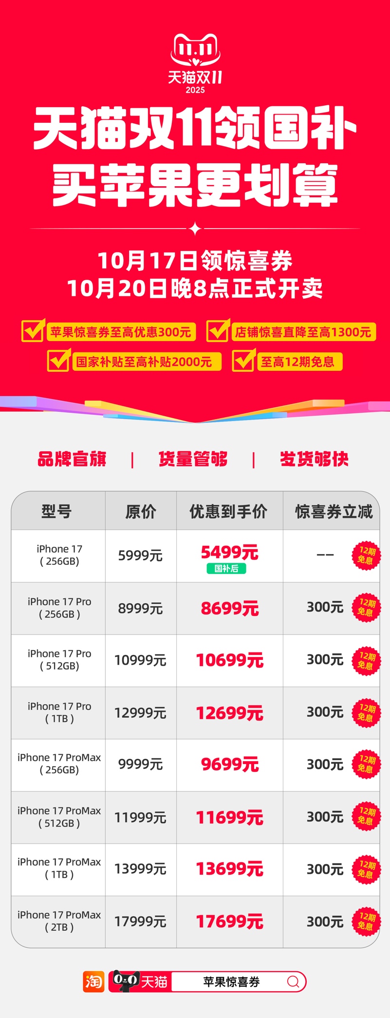 天猫Apple Store官方旗舰店公布双11优惠政策,iPhone17 Pro系列优惠300元。10月17日领惊喜券,10月20日晚8点现货开卖。