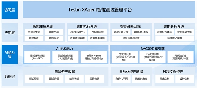 Testin云测的实践揭示了一个重要规律:智能化测试的进阶不是技术叠加,而是能力的系统性跃迁。在技术架构层面,其构建了完整的AI工程体系:数据层整合测试资产、AI能力层包含领域微调模型和多类Agent、应用层实现智能生成/执行/诊断/分析、访问层统一呈现。这个四层架构确保了AI能力的系统性和持续进化,如图4所示。