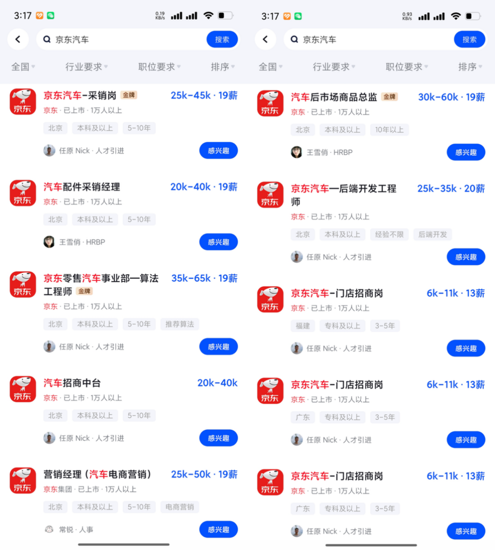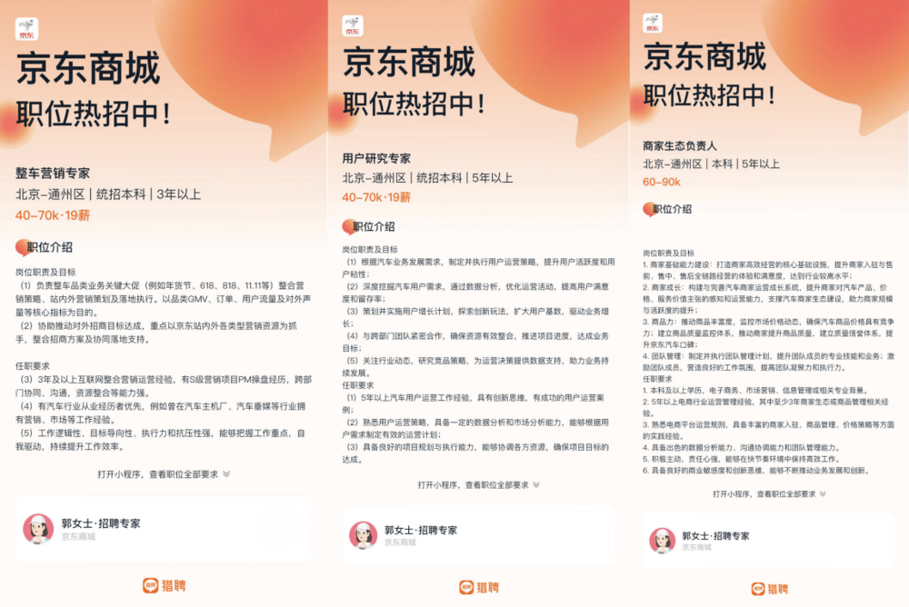 在新车信息密集曝光的同时,记者注意到,京东汽车近期在人才招募上也有大动作。多个招聘平台信息显示,京东汽车已释放多个高薪岗位,部分岗位年薪突破百万元:汽车零售事业部算法工程师岗位年薪最高可达123万元(35k-65k·19薪),汽车后市场商品总监岗位年薪最高可达114万(30k-60k·19薪),汽车行业采销负责人年薪最高可达112万(45k-70k·16薪),整车营销专家与用户研究专家年薪最高可达133万(40k-70k·19薪),商家生态负责人年薪最高也可突破百万(60k-90k)。知情人士分析,此举或为“国民好车”上市及后续用户运营、供应链管理储备核心力量。