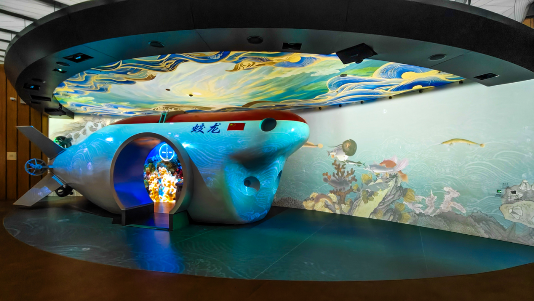 五洋遨游展项:该展项同样采用多点位、多角度隐藏式安装,实现“蛟龙号”装置与弧形背景墙、地面的融合投影。观众可与《海错图》鱼图案等墙面深海元素互动,感受中国传统海洋认知;还能操作探照灯与墙面投影互动,体验中国深海探索成就。