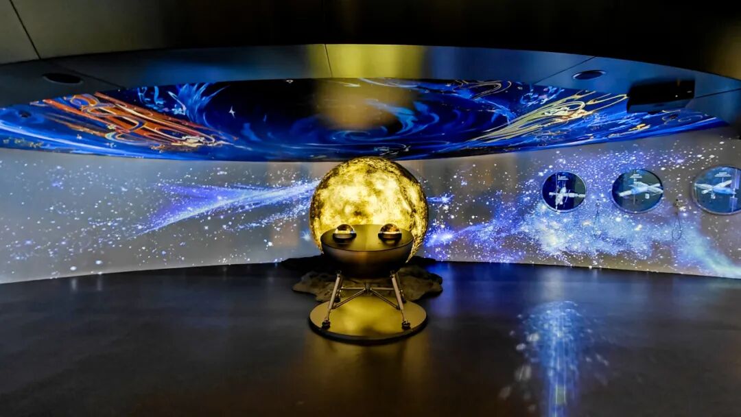 九天揽胜展项:投影机巧妙地隐藏安装,以弧形背景墙投影为基础,搭配全息投影交互装置,构建出一个极具未来感与互动性的空间。观众可以通过交互系统写下对航天事业的美好寄语,让寄语随着火箭“升空”,化作漫天的璀璨星光。