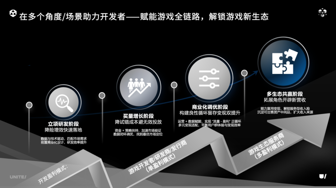 立项研发阶段,通过数据与技术双驱动,从源头匹配市场需求,告别“盲目研发”,降险增效,实现快速落地。买量增长阶段,腾讯广告与Unity分别加以策略、资金扶持,降低中小开发者 “试错成本”,精准找到市场定位,不断提升买量ROI。